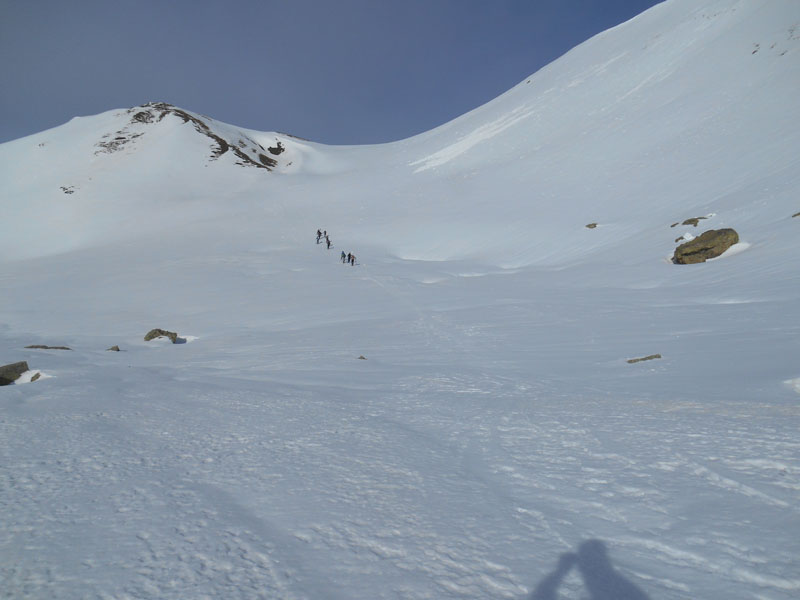 Nous nous arrêtons dans la pente pour déjeuner. Assez rapidement nous poursuivons la descente et stoppons avant le refuge de Pombie. Nous repeautons, pour monter sur la crête au-dessus du col de Soum de Pombie. Nous terminons avec les couteaux dans une neige gelée.