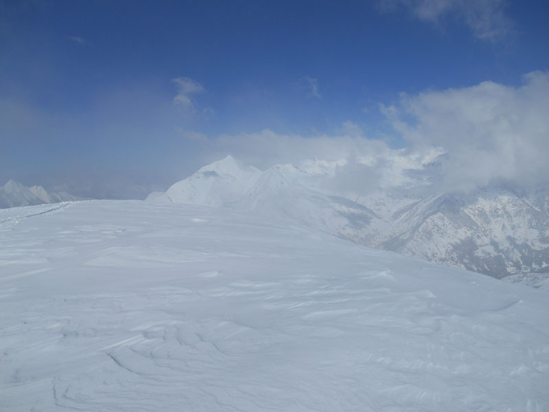 Le brouillard tente de perturber notre progression, mais les nappes vaporeuses sont peu épaisses. La crête s'élève vers l'est en passant par des bosses (une à 2076 m.). Elle n'en fini pas de s'étirer ! Enfin, à midi et quart nous atteignons le Mount Agut de Betpouey. Le ciel se débarrasse des nuages et les cimes apparaissent dans leur costume blanc neige. Chaque sommet se distingue par sa sculpture imprégnée sur fond bleu. Debout, nous déjeunons rapidement, guettés par le refroidissement.