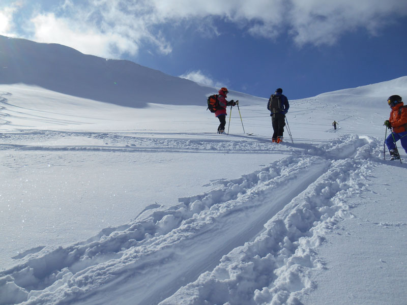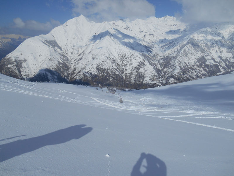Sorti du bois, nous dépassons des cabanes et traversons des pistes. Nous abordons l'immense vallon où nous rencontrons d'autres groupes de skieurs de randonnée. Du fait des risques d'avalanches (niveau 4), les montagnards se replient sur des lieux moins exposés !