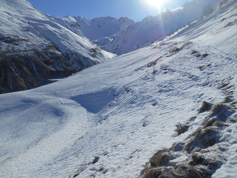 Le cheminement vers le sud-est nous entraîne dans des montées et quelques descentes, ou faux-plat. La traversée d'une énorme avalanche (200 m de large), entraîne à l'équilibre. Elle a dévalé des versants nord du pic de Létious. Le rythme est rapide et les rares arrêts très courts.