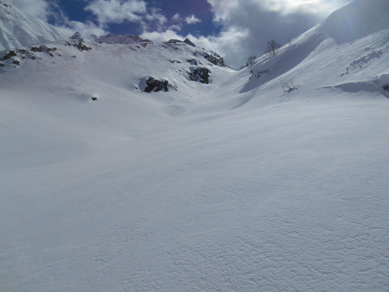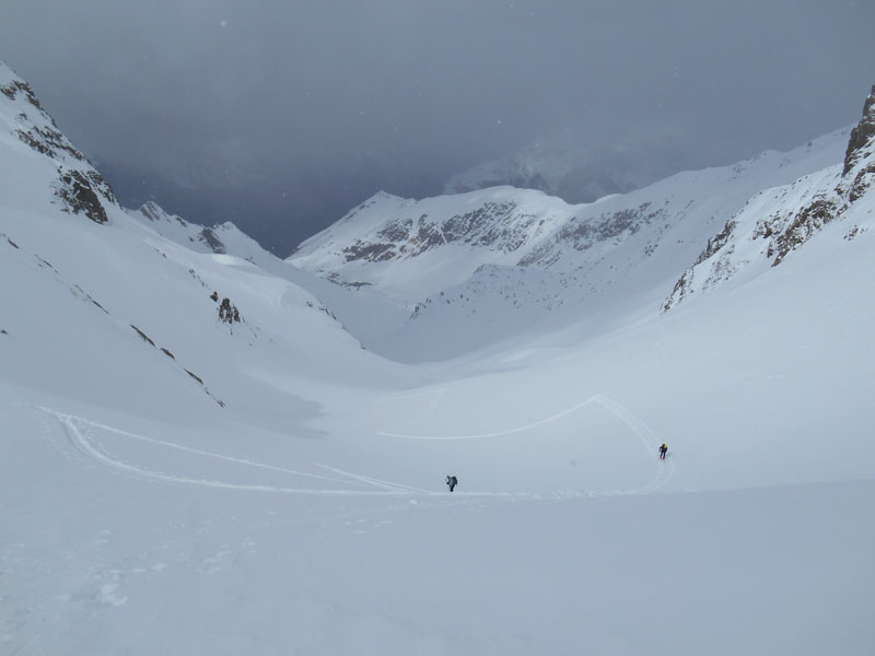 Nous nous jetons dans la pente (35 degrés). Par chance la neige est excellente à skier, car l'alternance entre jour blanc et soleil perturbe la vision. Les virages sont une leçon de plaisir, dans ce monde de glisse . La pause déjeuner est expédiée, dans l'ambiance de la journée. Après une remontée d'une cinquantaine de mètres, le vallon est atteint. Il reste encore quelques beaux virages, à styliser, puis nous retombons dans les avalanches. L'exercice d'équilibre sur les blocs glacés demande beaucoup d'énergie et les chûtes nous guettent.