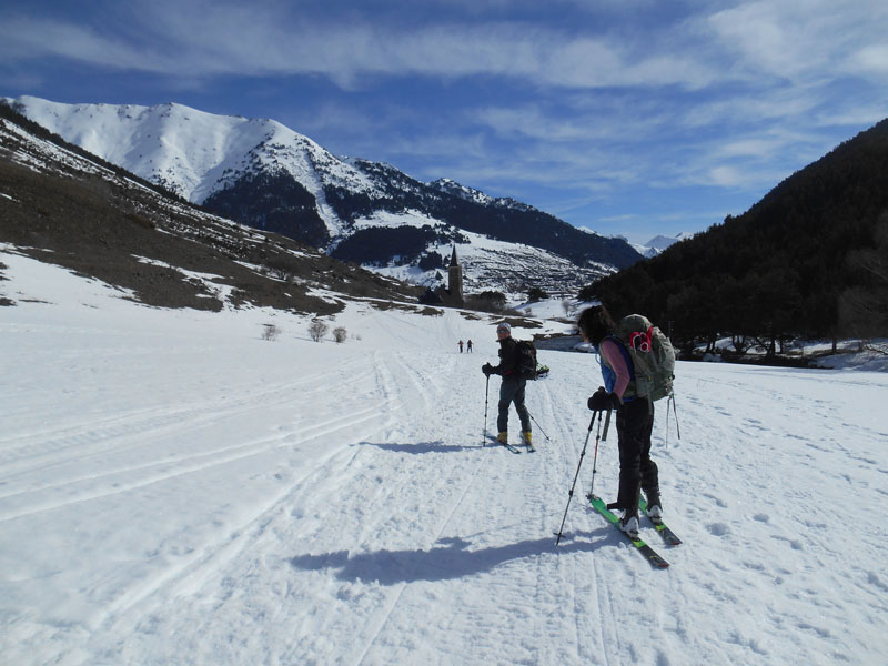 Niveaux:C'est de Beret que nous partons à 9 h 16, par un magnifique soleil sous un ciel bleu, sur une piste de ski de fond, en direction de l'est. Quelques montées et descentes permettent de retirer les peaux, malgré une neige gelée et des ornières qui ne facilitent pas la glisse. Le paysage splendide : crêtes enneigées, sapins sur les pentes sud, relief de dunes blanches ajoutent un air de féerie . Après une heure et demie de traversée, le petit hameau de Montgarri se découvre, où refuge et église se partagent le site.