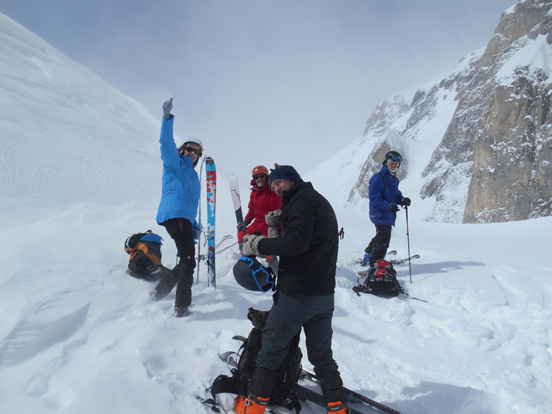 Secoués par le vent nous dépeautons, cherchant en contre-bas un coin contre la roche. Puis c'est l'envol dans la descente pentue. La neige est curieuse, tantôt poudreuse avec une glisse agréable, tantôt gelée, surprenante, provoquant des chûtes.