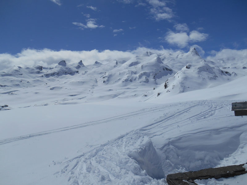 Nous revenons sur le fil de la crête et parvenons sur une bosse, vers 12 h 50. La plongée dans le versant, absent de relief visible, s'avère aléatoire. La neige n'est pas régulière et c'est souvent au dernier moment qu'est réalisé le changement de texture, ainsi que les bosses et les creux. Lors d'une chute je dis à mes amis que dans la poudre je m'extasie (ecstasy). Nous parvenons à la cabane de Sénescau (1812 m.). Assis sur une murette, exposés au soleil, nous déjeunons, tout en profitant de la vue dégagée des cimes au sud.