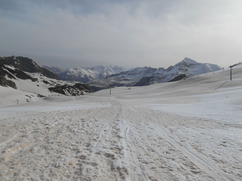 Une arête fine et délicate est à franchir sur quelques mètres. Une fois franchie, par une corniche, la plongée dans la piste noire est impressionnante. La neige reste agréable à skier et nous évoluons d'un endroit à l'autre à la recherche de la meilleure glisse. Ensuite, nous filons sur la piste enneigée, mais dans une neige plus lourde. La traversée de l'avalanche à vitesse réduite, nous mène à notre coin déjeuner. Le ciel se voile.