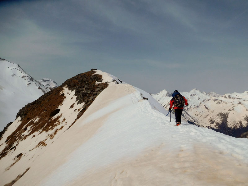 Nous effectuons la trace parmi d'autres. Après de nombreuses conversions sur une crête étroite, nous atteignons la première pointe. A pied, à l'aide du piolet, s'enfonçant dans la neige de la corniche, nous suivons l'arête fine, vers l'ouest, où nul autre passage se signale. Il est 11 h 30, lorsque nous atteignons le pic Entre-Les-Ports. La vue sur les sommets est splendide. Du Piméné, Astazou, Taillon, Soum Blanc des Especières, au Soum Blanc de Sécugnat les pics étalent leurs découpes blanches.