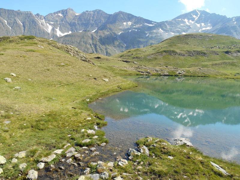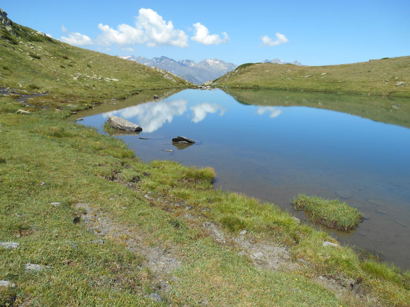 J'en profite pour monter sur une butte près de la crête. La suite est trop raide, avec des barres rocheuses. Je retourne avec mes amis qui déjeunent. Même s'il n'est pas midi, j'en fais autant. Un gros nuages voile le soleil quelques minutes. Cela n'empêche pas les poissons de sauter et attraper des insectes.