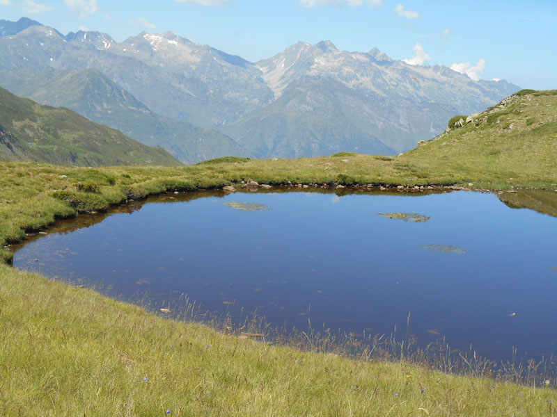 Après les cabanes de Baserque, nous débouchons sur le vaste vallon, parcourus de bruyères, rhododendrons, myrtilliers,, oeuillets, linaigrettes, chardons, aconits et autres renoncules. Une autre montée raide traverse le ruisseau de Bassia. C'est à 11 h 15 que nous parvenons sur les berges du joli lac de Bassia. Cette perle bleutée reflète les petites montagnes proches et les pelouses verdoyantes. Trois nuages passants jettent leur signature sur l'onde limpide. De l'ouest à l'est défilent les sommets : Vignemale, Chanchou, pic de Campbieil, pic Long, Port de Campbieil et apportent un décor exceptionnel dans ce paysage sublime.