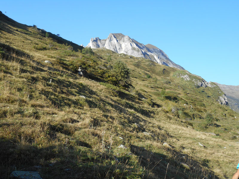 Nous atteignons des pentes herbeuses toujours bien raides et un semblant de sente, marqué de quelques cairns. Nous longeons une crête pour atteindre un petit col. Le paysage coté sud se révèle avec le Cirque de Gavarnie, le Casque, la Tour, la Brèche de Roland, la Fausse Brèche, le Taillon et le Vignemale à l'ouest. Magnifique !
