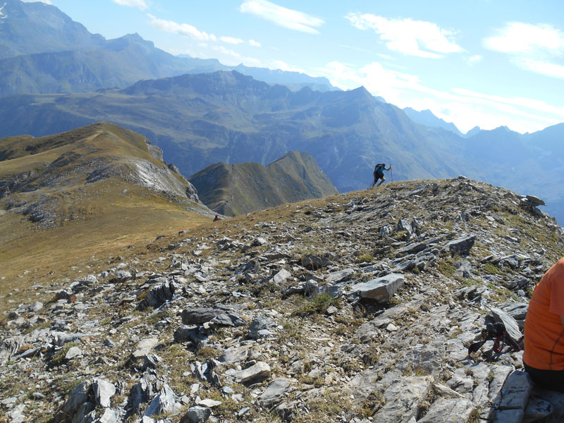 Nous franchissons des petits balcons herbeux et caillouteux qui ne permettent pas de repérer l'itinéraire. Des barres rocheuses coupent le passage. Michel D., Marie-France et moi-même, nous nous engageons dans une cheminée, plutôt raide. Plusieurs mètres après nous sortons de cette difficulté. Le reste du groupe a trouvé un passage plus facile.