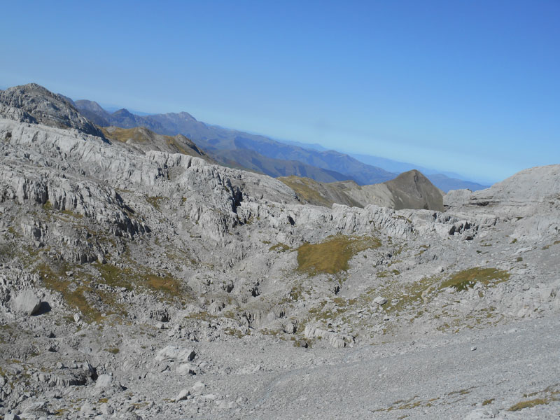 Le lac d'Anie (2042 m.), n'est plus qu'une zone humide. Avançant vers le sud-ouest, traversant les lapiaz, nous grimpons sur des falaises abruptes, dans les rochers et cailloux. Apparemment ce n'est pas le bon cheminement !