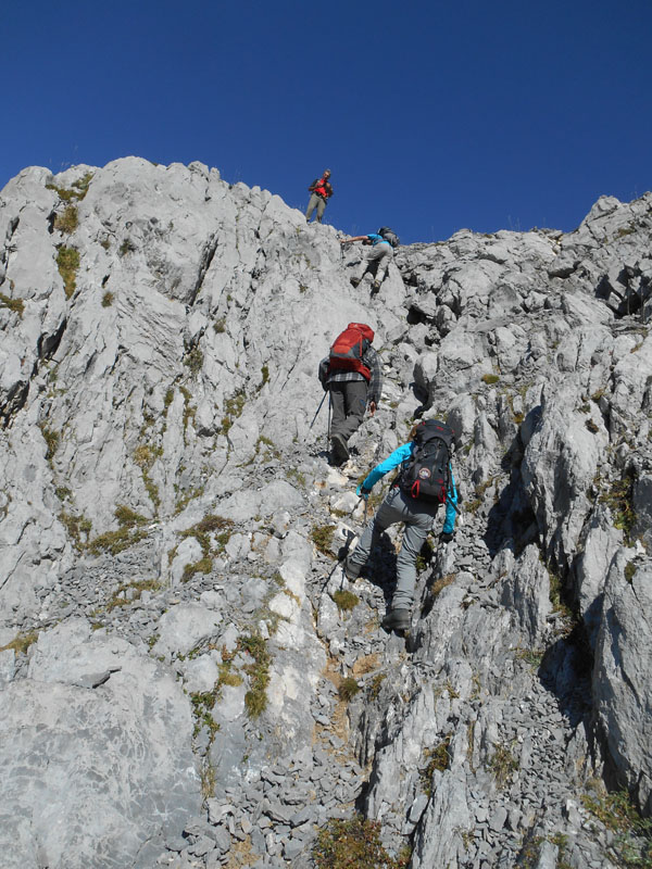 Après le repas nous descendons, vers 14 h, à travers les éboulis et les rochers, au pays des lapiaz, tentant de deviner le cheminement. Ensuite c'est l'enchaînement des deux cheminées et les cailloux qui roulent sous les pas, puis la recherche des prises stables. Nous sommes quatre devant à ouvrir la voie. Arrivés au col des Anies, nous retrouvons Miller qui a évité l'ascension.