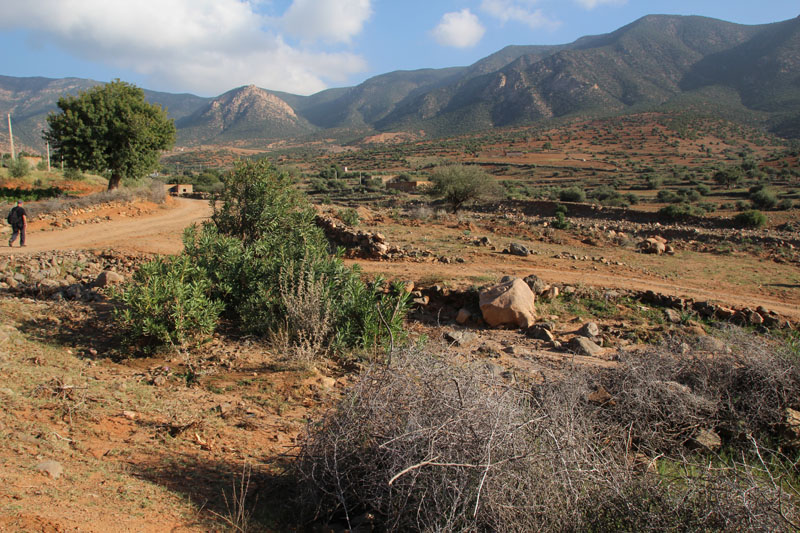 Le plateau désertique vers le village d'Alouana est typique de cette région. Une école, au milieu de rien, des ânes transportant du bois de chauffage ramassés par des femmes, attelés par deux hommes et la piste qui se dirige vers la montagne, deux ou trois maisons perdues dans l'immensité de ce paysage peu ordinaire. La piste plonge dans un ravin pour remonter sur un rocher où s'accroche le village des potiers d'Alouana.