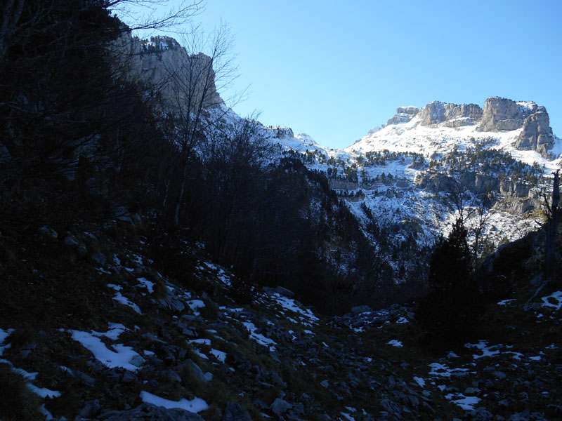 Dans la descente, la vue sur les sommets et les Orgues, les rochers ciselés découpant le ciel est d'une beauté insaisissable. Les passages ombragés dans le bois accentuent le gel. La remontée à la cabane d'Ichéus nous entraîne à nouveau au soleil. Nous suivons la crête vers le nord, avec vue sur le Layens. Nous filons dans le bois entre la piste et les sentiers, pour arriver à la clairière à 15 h 25.
