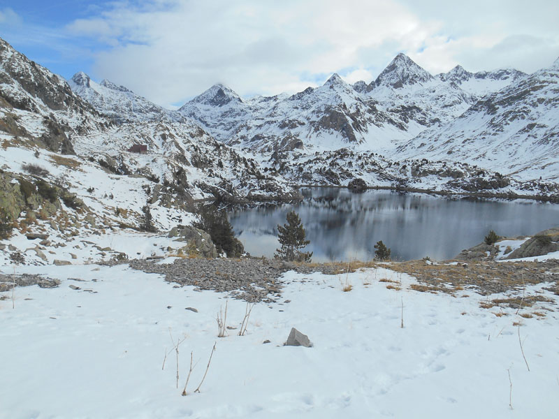 Le cirque de Piedrafita, s'étale de la Fache à une multitude de pics : Punta Zarre, Pico de Llena Cantal, Pico dera Forqueta, las Musales. Le lac (embalse) de Respomuso semble absorber les montagnes. Ses eaux noires et limpides reflètent les cimes enneigées, comme si la montagne avait plongé dans ses profondeurs. Nous déjeunons au bas du refuge profitant d'un magnifique paysage.