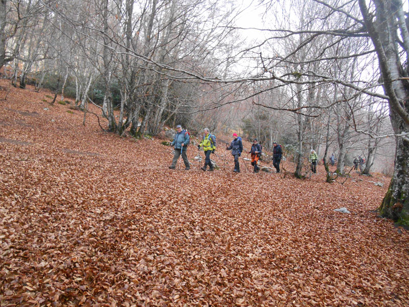 Nous repartons, renonçant au pic de Boun, du fait du brouillard. Nous descendons dans le bois sur le sentier boueux et effectuons une boucle. Le sentier conduit au pied des falaises où nous découvrons des grottes. La première profonde de quelques mètres est exiguë vers le fond, fermé par les rochers. La seconde se présente plus étroite, mais aussi longue. La troisième relativement spacieuse, nommée: Église, a une partie ouverte comme un balcon et tourne vers l'intérieur de la roche. Inutile de préciser que les camarades dans ces grottes ont comme un air de Neandertal ou Sapiens non érectus... Sortons vite de ces grottes !