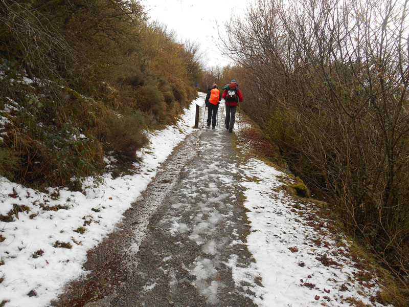 Malgré un temps exécrable, nous sommes dix à braver les éléments météorologiques perturbés. Miller A., nous conduit, avec Michel Cl. et Dominique N.. Il est 9 h 30, de la côte des Courriers nous prenons le chemin dans le bois. L'humidité donne l'impression de froid. Mais les capes de pluie, commencent à réchauffer et condenser. Les nuages s'agitent au-dessus de nos têtes.