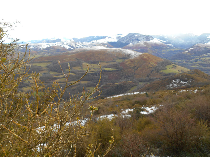 Le chemin part vers le nord. Le vent souffle fort, cependant les arbres du bois protègent des courants d'air. Le sentier traverse le Pré de la Pie, proche de la Pierre des Chiens. Ensuite nous arrivons au Petit Jer, vers 11 h. La vallée est encore dégagée des masses brumeuses. Quelques sommets apparaissent : Le Béout, le massif du Pibeste, etc.