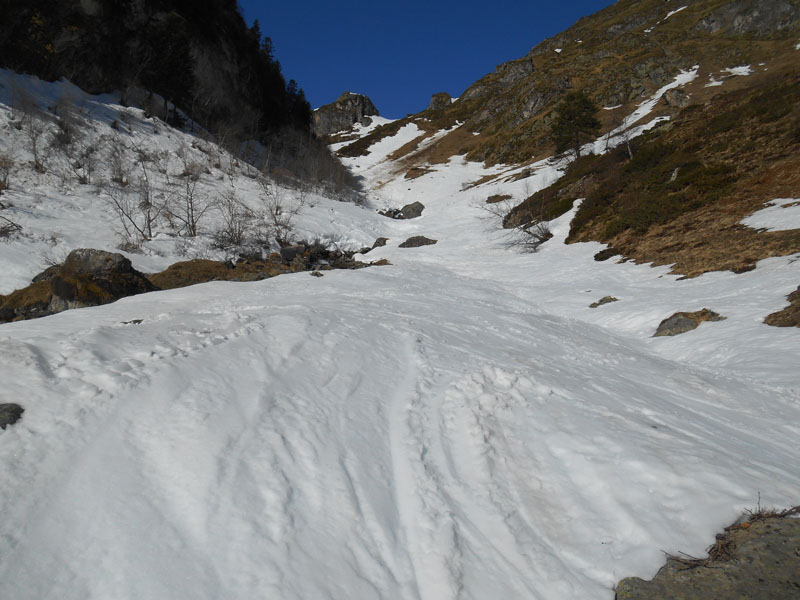 8 h 15, nous portons les skis sur le sentier en direction de l'ouest, à travers un bosquet. Après le croisement des sentiers Arbizon, au nord et Auloueilh à l'ouest, nous suivons cette direction. Le passage du ruisseau nous amène au bord de la goulotte. Un restant d'avalanche et des plaques de neige nous permettent de monter le couloir raide, skis aux pieds.
