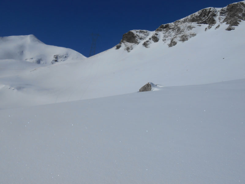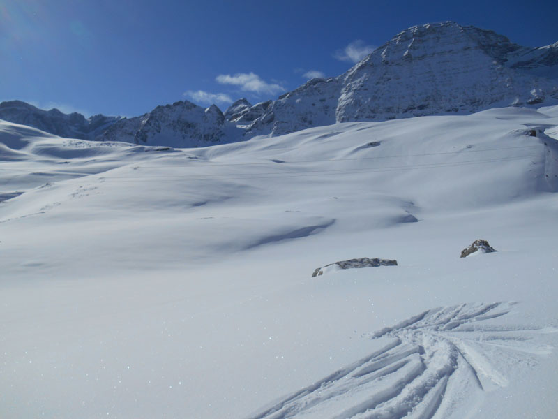 Nous chaussons les skis et plongeons dans la forte pente. La couche de neige fraîche permet de skier convenablement même si dans certains virages la neige fuit et les spatules crissent sur la neige gelée en dessous. À distance les uns des autres pour éviter les plaques, le jeu consiste à dessiner des virages, sans se laisser surprendre par les dérapages involontaires.