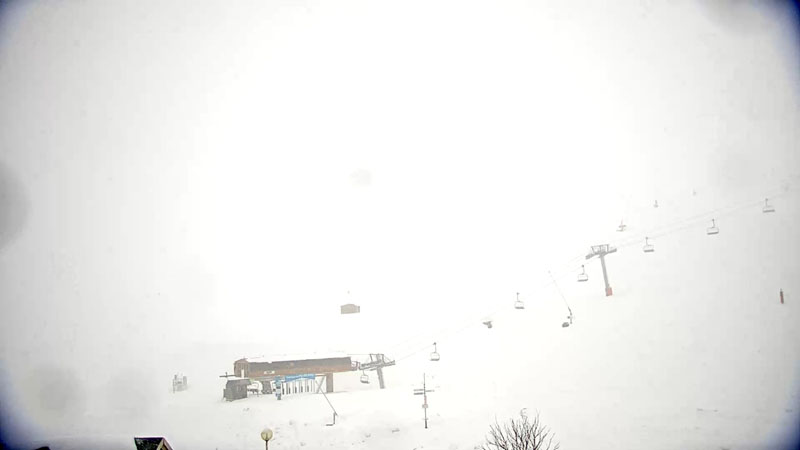 Arrivé au bas de la station 11 h 45. Un bus garé sur un des parkings nous offre un abri pour déjeuner. Une tempête de neige s'abat sur la montagne.