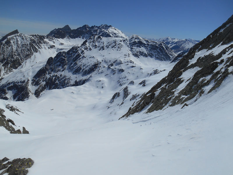 De nombreuses coulées de neige s'exposent dans les fortes pentes. Passé le secteur de Bezou, nous posons les couteaux sous les skis pour monter vers le Plaa de Ségoune en neige gelée. Le rythme régulier sans accélération convient au groupe.