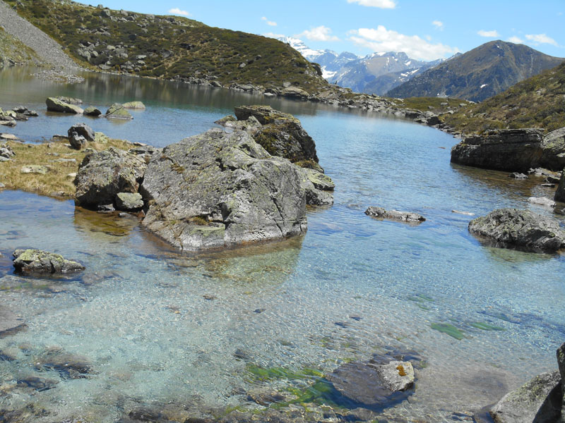Contre la falaise nous avançons avec précaution sur le passage en à-pic, humide par endroit. Ainsi nous parvenons au-dessus du lac d'Antarrouye. L'eau limpide laisse apparaître les fonds de roches, le gravier, les plantes aquatiques et les poissons.