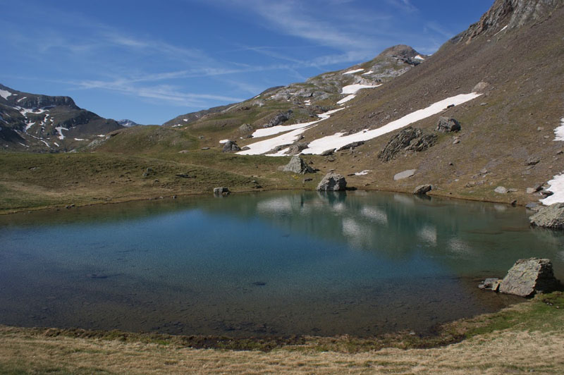Le modeste sommet imposant de loin, domine un petit lac et les sommets proches. Le sentier nous mène vers une variante du GR10. À l'avant avec Miller et Patrick, franchissant le gave d'Ossoue, nous gagnons la piste, pour arriver aux voitures à 15 h25. Le ciel, qui se couvrait de nombreux nuages, se dégage à nouveau. La chaleur est élevée. Nous apprécions de déguster gâteaux et boissons, dans un bar à Gèdres.