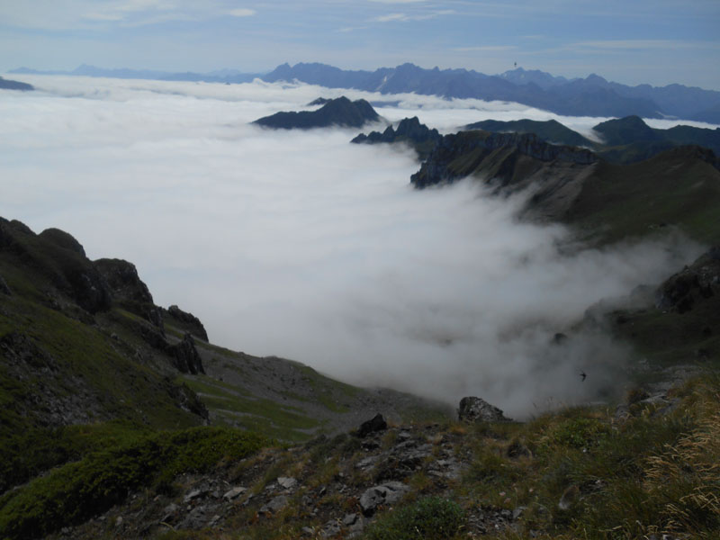 Du coté de la vallée d'Aspe, la mer de nuages, là encore, couvre les montagnes. Le pic d'Anie surgit, comme le Billare et la Table des Trois Rois. Une longue crête nous amène au sommet du Mailh Bassibé. Il est 11 h 15. Nous observons le paysage, les cimes qui nous entourent.