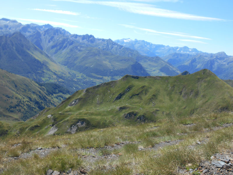 Dans le secteur de la Grande Estibère, la montée vers le sud est raide. Nous parvenons sur une brèche (2154 m.). De l'autre coté Est, un autre paysage de vallons et de prairies se heurte aux pentes du Soum de Lascours.