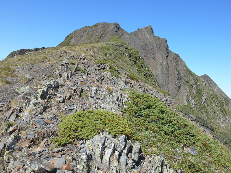Nous quittons le sommet étroit par la descente de l'arête, pour nous installer au dessus du col, dans un petit espace herbeux et nous déjeunons face aux cimes, dans une ambiance agréable. 13 h 30, c'est le moment de la descente, d'autant que nous devons récupérer John qui nous attend plus bas.