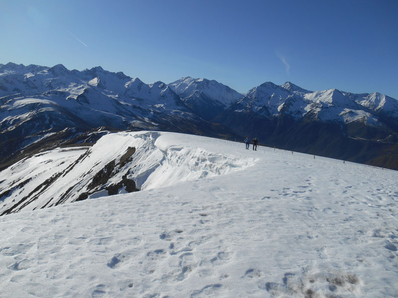 Nous arrivons devant des pentes de neige. Mes camarades mettent les crampons à glace. Constatant que la neige n'est pas vraiment glacée je grimpe, sans difficulté, au Cap de Hont Nère. Puis c'est la descente à la Porte de Lis. Suivant la crête toujours vers le nord, celle-ci remonte au Sommet de Pouyaué. Une autre descente à 2011m nous entraîne sur une quatrième montée, passant la bosse Les Costes (2054 m.), pour arriver au Sommet de l'Aigle.