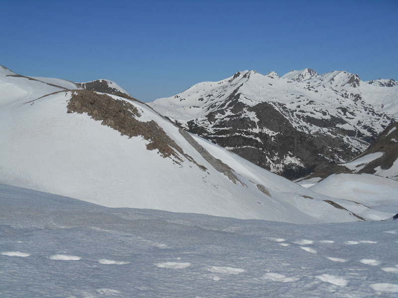 Puis nous remettons les peaux et grimpons la longue pente sud vers le col d'Anéou ou de Bious. Un passage herbeux contraint à déchausser et porter les skis sur quelques centaines de mètres. La course est sportive ! Nous rechaussons et finissons par gagner le col d'Anéou. Nous retirons les peaux. Alors c'est la plongée dans des pentes nord, avec une neige légèrement gelée. La danse avec les skis reprend dans un relief très vallonné. La glisse est un plaisir, évoluant sur les bosses, dans les creux, contournant les obstacles, comme des surfers sur les vagues neigeuses.