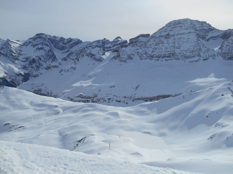 Venant du sud-ouest le vent froid souffle fort. Pour une période de vacances scolaires il y a peu de skieurs. Longeant les pistes de ski, nous parvenons sur le plateau de Saint André. Malgré le soleil, le froid persiste et la neige est gelée.