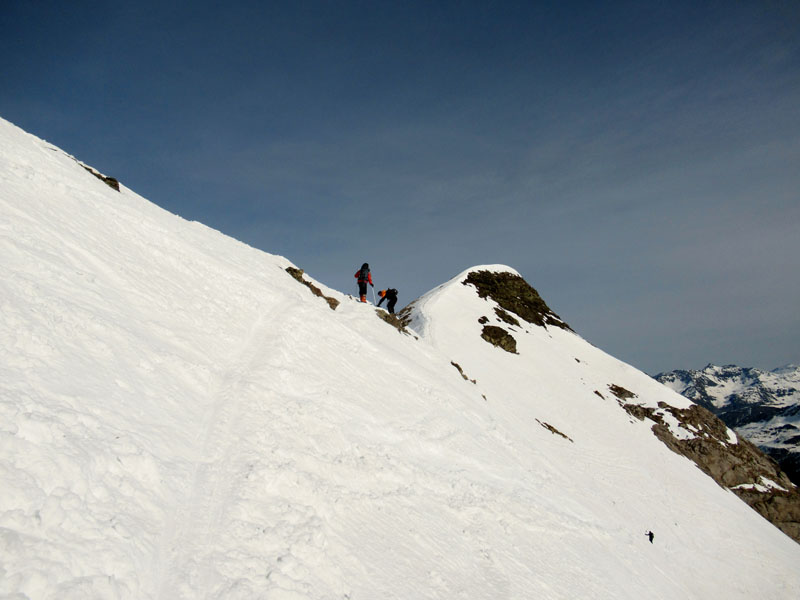 Nous posons les couteaux sous les skis. La longue pente ouest grimpe vers la crête de Saint André. Nous progressons en larges lacets, cherchant les passages les moins glacés, mais parfois sans succès. La chute est à éviter!