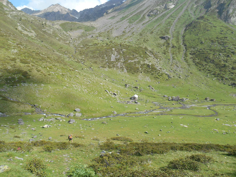 Une pause à la cabane d'Auloueilh s'impose, pour une collation. Deux jeunes bergers arrivent pour remettre en état la cabane, avant les estives. Nous discutons un moment. Un sentier monte, au sud et sud-ouest, que nous prenons après le passage de plusieurs torrents.