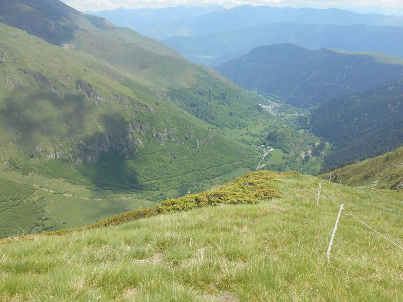 La clôture s'arrête, mais nous poursuivons la crête de Hossés. À droite, au nord les falaises sont en à-pic. Minuscule, la cabane d'Auloueilh semble un jouet. Du sud au nord paraissent le Pla d'Adet, le col de Portet, les sommets sont dans les nuages, le pic d'Aulon, l'Arbizon, et d'autres encore.