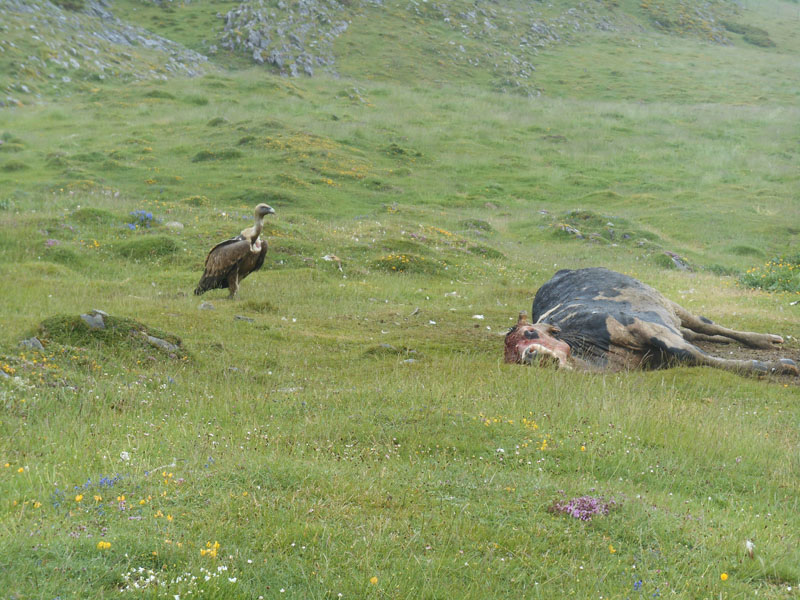 Avant le col de Jaut, nous remarquons de nombreux vautours en vol et se posant. C'est en approchant que nous constatons une vache morte et les vautours qui se disputent la dépouille. Ils attendent que l'on s'éloigne pour déchiqueter leur pitance.