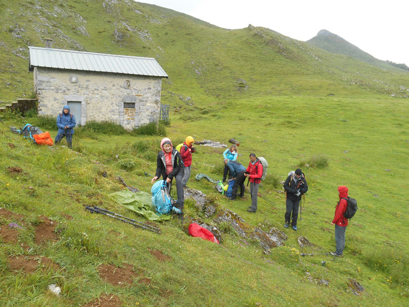 Le cheminement part au nord vers Lagouare à travers les rochers, puis entre dans le bois. Une forte averse s'abat. Les capes de pluie sont bien utiles et la bonne humeur persiste. Parvenus sur un vallon, se dresse au loin, la cabane Couscouilla. Construite de pierre et de cailloux, la cabane est posée sur un monticule de terre. Elle est occupée par quatre randonneuses. Nous ne pouvons nous y installer !