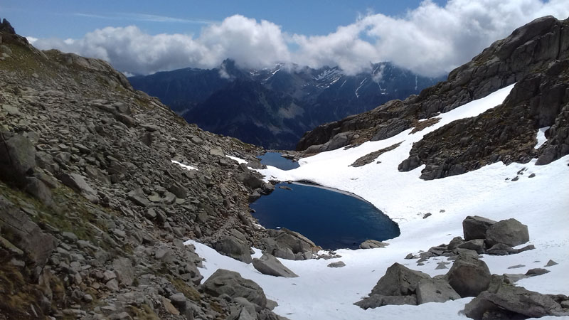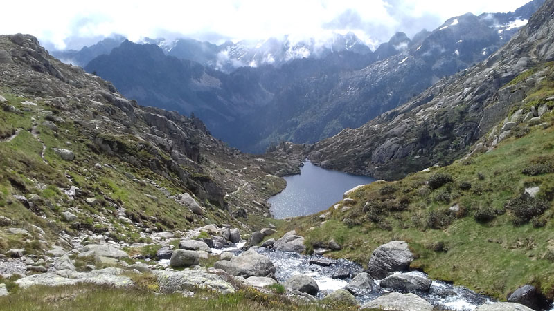 La descente est longue pour atteindre les lacs de l'Embarrat. Les couleurs de l'onde changent : vert lagon, gris des nuages, transparente au bord. Deux marmottes filent devant nous. Le plat de l'avancée belvédère est franchi avec Patrice et nous dévalons les éboulis. Mais le groupe ne suit pas. Nous revenons en arrière pour retrouver les camarades sur le belvédère avec l'autre groupe.