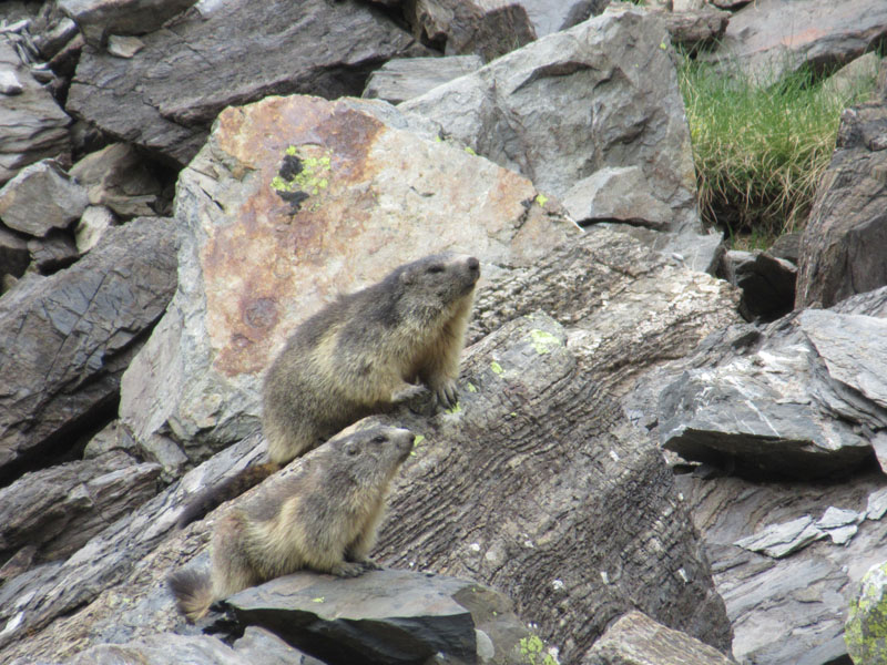 En chemin, nous admirons des marmottes jouer entre elles : mère et petit. La descente est paisible le long du vallon. Nous croisons quelques randonneurs. Le soleil réapparaît et les sommets se découvrent. La chaleur remplace la fraîcheur des hauteurs.