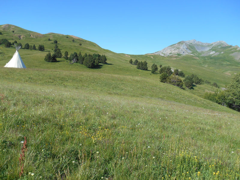 De la route, plus bas, à Puente de Sestas, par un vent froid, à 8 h 40, nous montons par un sentier s'élevant vers la station de ski de Formigal. Il nous amène dans un vaste vallon, où deux tipis sont plantés. Au loin nous remarquons les crêtes et quelques pylônes et câbles qui signalent le terminus.