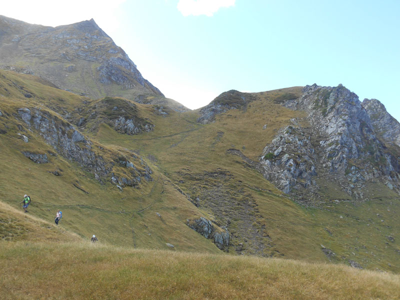 Nous redescendons de la crête de la même façon, puis partons à droite, Est. Le sentier passe près d'une cabane en ruine, emportée par une avalanche. Le sentier traverse les pentes des flancs du pic de Léviste et Soum Arrouy, puis traverse la brèche d'Estibère. Il redescend vers le nord dans la Grande Estibère.