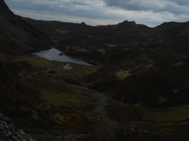 Nous contournons le lac d'Isaby, que nous contournons vers le sud. Le ciel est bleu, parsemé de quelques nuages. Le soleil s'élève à peine, frôle les cimes. Le lac expose ses eaux sombres qui attendent le réveil du soleil.
