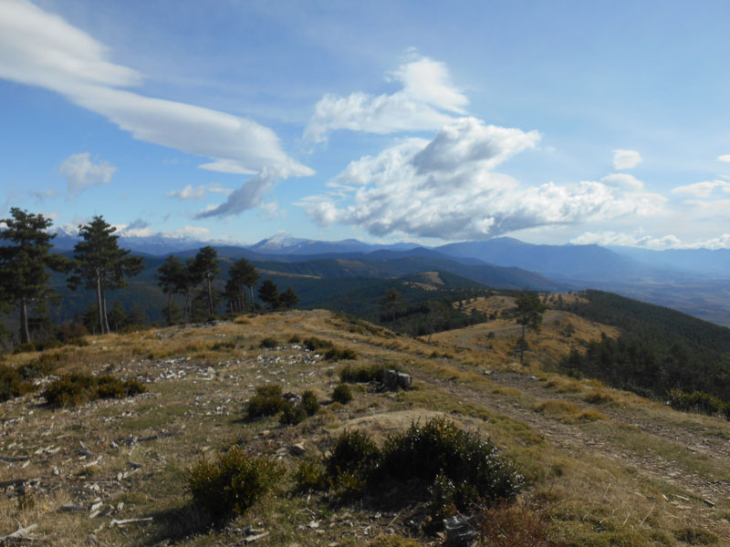 Le panorama est grandiose. Les cimes enneigées, hors nuages, sont dominées par la Collarada, Collaradeta, Peña Somola Alta, Peña Rotona, Puerto Rico, etc. Au sud le Tozal de Guara brille sous le soleil, la sierra del Gratal cache les Maillos. Nous déjeunons en contrebas à l'abri du vent froid.