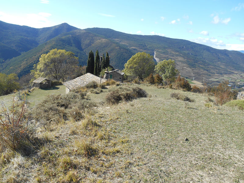 A 9 h 40, après avoir traversé la voie ferrée, nous longeons un canal et montons dans la forêt. Le vent du nord est glacial, mais les arbres protègent, ainsi que l'effort. Sortant du bois, un petit plateau se présente, avec des maisons en ruines, hormis une grange rénovée. C'est le hameau de Bergosa posé dans un cadre de verdure et laissant apparaître la plaine et ses villages, Jaca, la chaîne des Pyrénées au nord, la Peña de Oroel au sud.