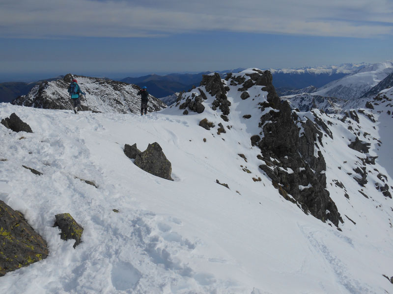 Yves propose de tenter le Pène Nègre. Nous descendons la crête, pour la remonter à l'est et laissons les skis près d'un gros rocher. La neige est un peu dure. Malgré tout sans piolet, ni crampons nous parvenons au Pène Nègre. De ce sommet aussi la vue est superbe. Quelques photos prises et nous allons au bout d'une petite arête. Nous repartons alors qu'un groupe de randonneurs à pied, monte au sommet.