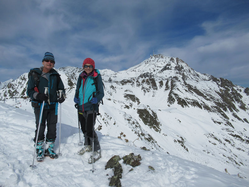 Nous dépassons un petit bâtiment de la station de ski, puis par 2 fois traversons la route qui monte au col du Tourmalet. Sur les pentes plus raides la neige est plus épaisse. Le cheminement que nous prenons amène sur une crête du secteur Coume Loungue. C'est le haut des remontées mécaniques, où s'entassent les randonneurs à raquettes et en skis.