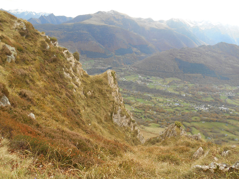 La vue est panoramique du pic du Midi de Bigore, à l'est, Cabaliros, pic du Midi d'Arrens, Balaïtous, Gabizos, pic de Bazes à l'ouest. La crête s'affine en arête aérienne, par un à-pic au sud et une montée pentue au nord au-dessus d'une forêt de hêtres. Les passages sont escarpés, mais pas glissants si on reste bien sur le rocher solide. L'un des passages abrupt et étroit oblige à utiliser les mains et nécessite de ranger les bâtons.