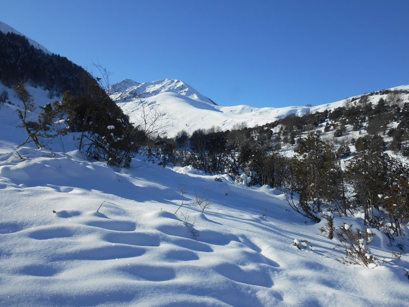 La descente dans la neige poudreuse est agréable. Nous filons dans la longue pente pour atteindre la crête. Nous la suivons en tentant d'éviter les rochers et cailloux. Nous passons au-dessus des Courtaous, puis rejoignons le secteur des Artigussy. Il faut chercher le pont pour franchir le ruisseau. La piste remonte et longe le bois. De plus en plus de randonneurs à raquettes se baladent.